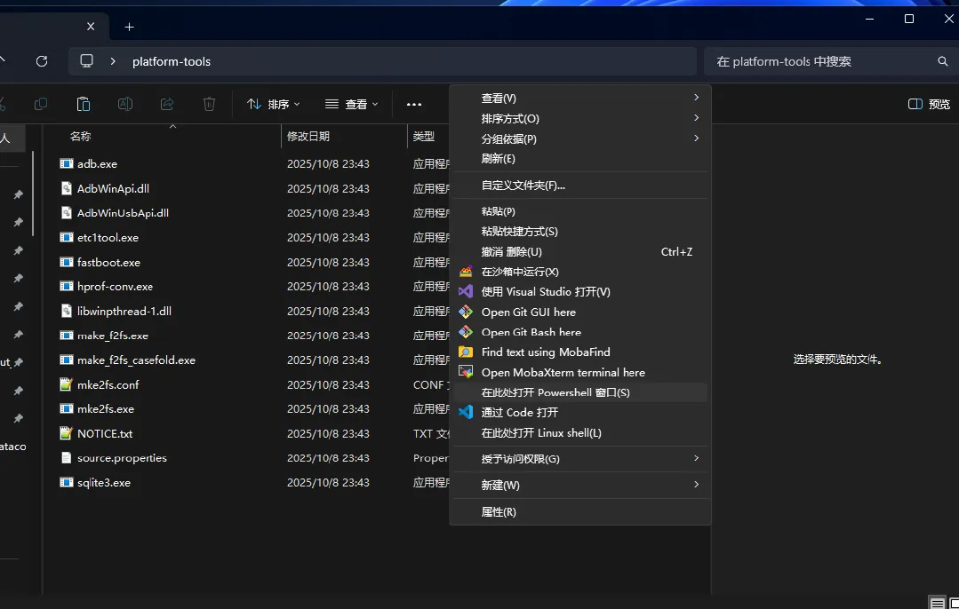 shift+鼠标右键,选择在此处打开powershell窗口